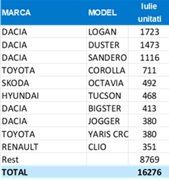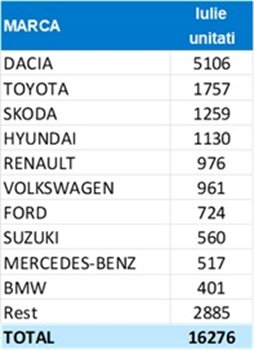 În același timp, înmatriculările de autoturisme pur electrice înregistrează o scădere de 17,8% față de iulie 2024, realizând o cotă de piață de 3,2%.