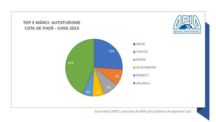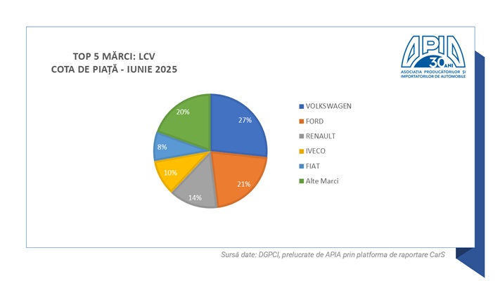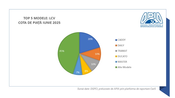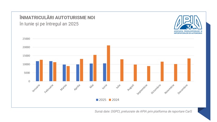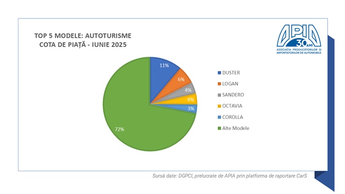 I. Autoturismele (care reprezintă aproximativ 80% din total piață) au înregistrat, în luna iunie 2025, un volum de 10.522 unități, cu 50% mai puțin față de luna similară din 2024.