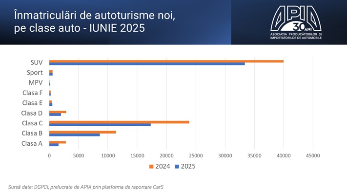Segmentarea pe clase: În luna iunie 2025, față de aceeași lună a anului trecut, se observă o evoluție mixtă a segmentelor în care sunt încadrate autoturismele: