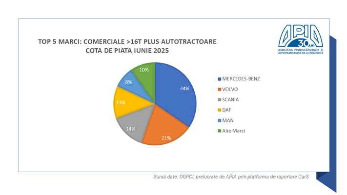 III. Vehiculele comerciale grele și bus înregistrează, în iunie 2025, o creștere de 32,5% față iunie 2024, din care vehiculele comerciale grele peste 16 tone plus autotractoarele înregistrează o creștere de 39,2%.