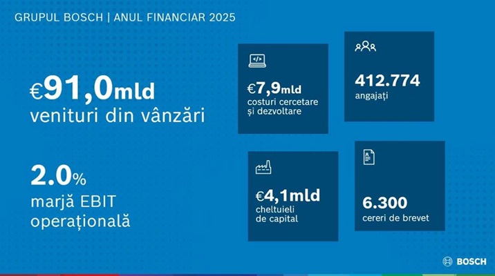 În ciuda provocărilor semnificative, Bosch a realizat venituri din vânzări de 91 miliarde de euro în anul financiar 2025, ușor peste nivelul anului precedent (2024: 90,3 miliarde de euro). Ajustat la efectele ratei de schimb valutar, acest rezultat corespunde unei creșteri de 4,1 procente. Marja EBIT operațională s-a situat la 2 procente, sub nivelul anului precedent (2024: 3,5 procente), iar ajustările structurale și de personal necesare pentru a crește viabilitatea pe termen lung au avut un impact negativ considerabil asupra rezultatului, sub forma unor provizioane de 2,7 miliarde de euro.