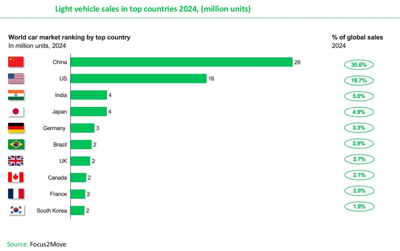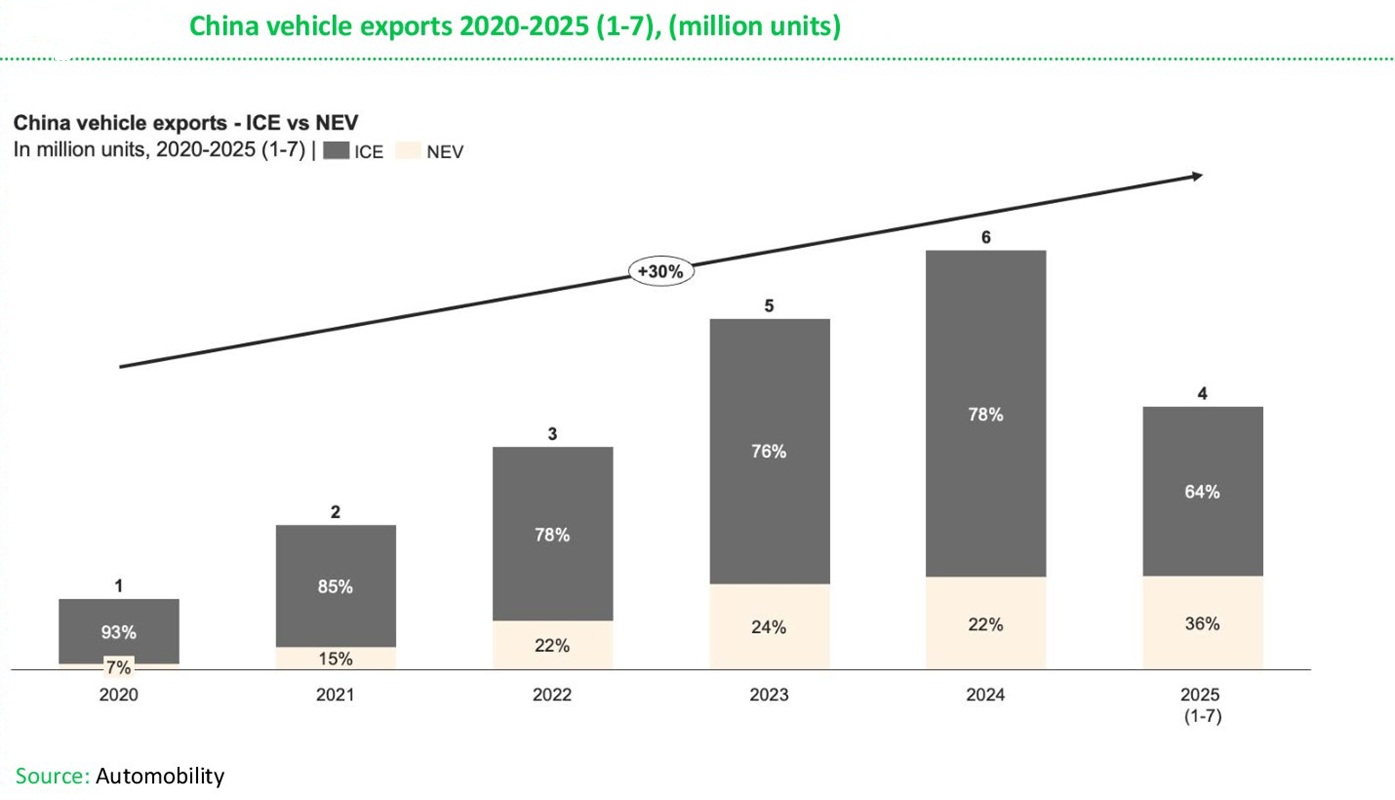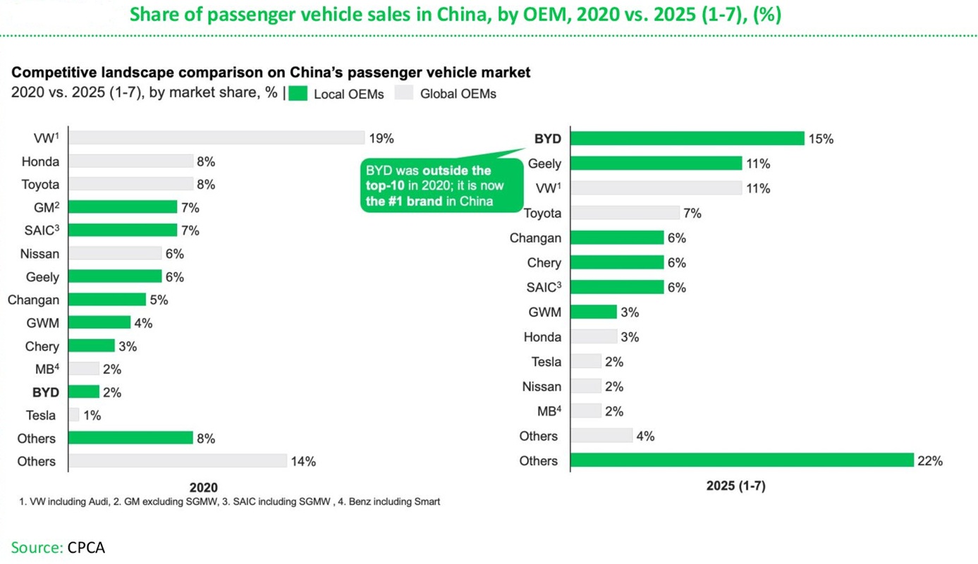 China a devenit centrul de gravitație al industriei auto globale. Reprezenta aproximativ o treime din producția totală de vehicule în 2024 și aproape 80% din producția globală de baterii pentru mașini electrice. Între timp, producătorii auto locali, impulsionați de electrificare, au acaparat o cotă de piață semnificativă pe cea mai mare piață auto din lume: mărcile chineze reprezintă acum 65% din vânzările totale de autoturisme, comparativ cu 36% în 2020.
