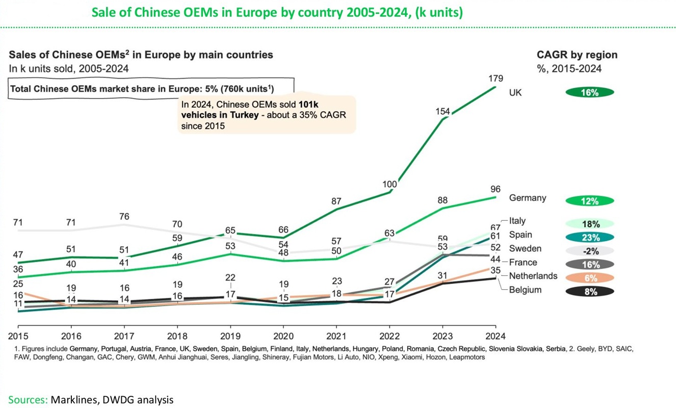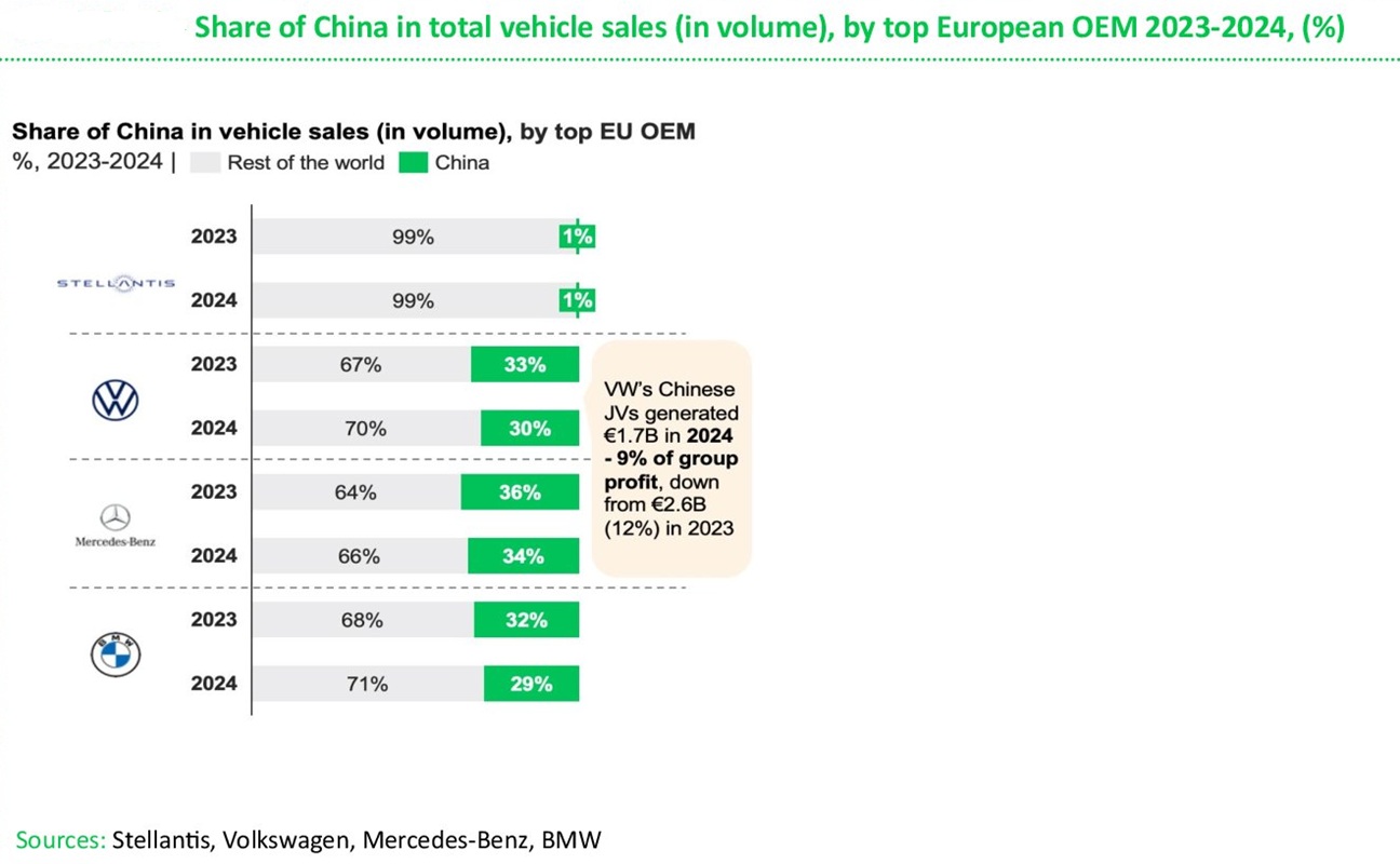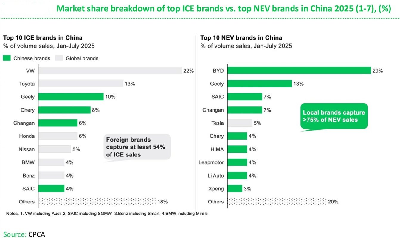 China a devenit centrul de gravitație al industriei auto globale. Reprezenta aproximativ o treime din producția totală de vehicule în 2024 și aproape 80% din producția globală de baterii pentru mașini electrice. Între timp, producătorii auto locali, impulsionați de electrificare, au acaparat o cotă de piață semnificativă pe cea mai mare piață auto din lume: mărcile chineze reprezintă acum 65% din vânzările totale de autoturisme, comparativ cu 36% în 2020.