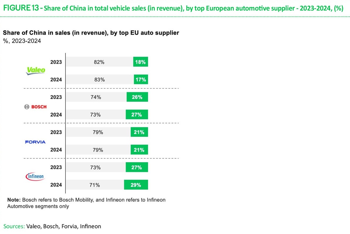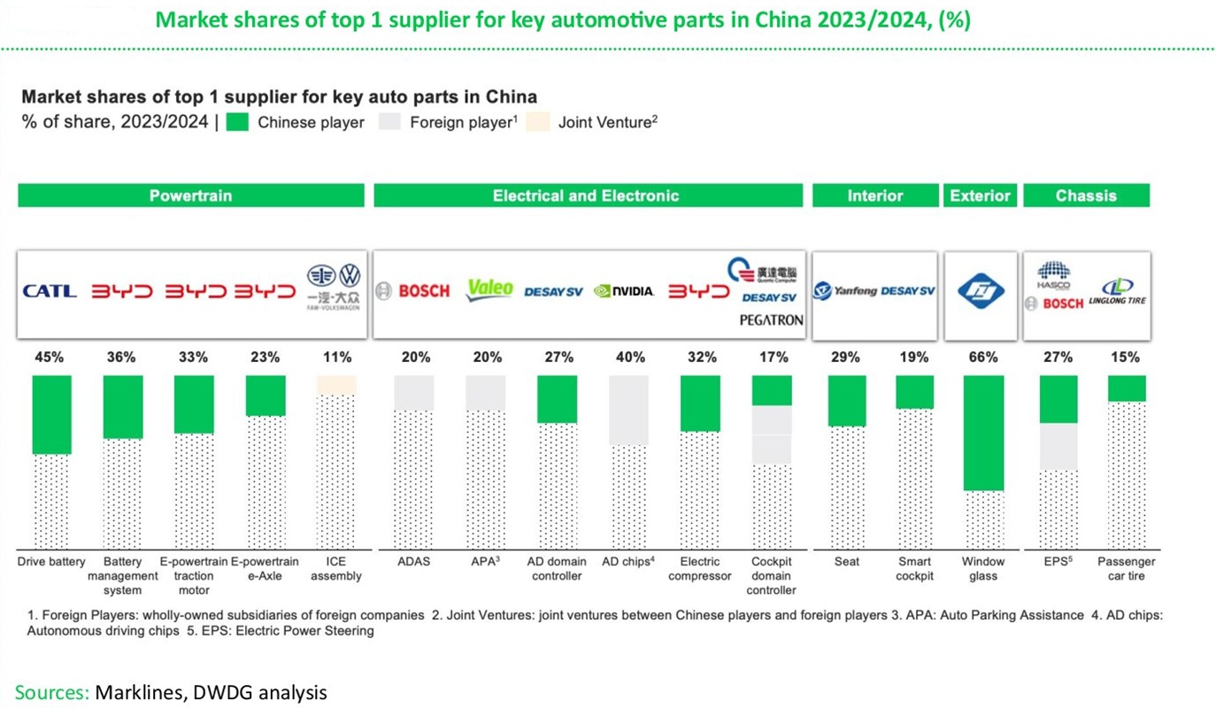 Mai mult, furnizorii chinezi și-au redus decalajul tehnologic pentru a se poziționa în segmentele superioare ale lanțului valoric, arată raportul. De exemplu, CATL a devenit lider pe piața bateriilor cu o cotă de piață de 45% în China, urmat de BYD cu 36%. Desay SV domină segmentul cipurilor pentru conducerea autonomă (27%), iar Fuyao este principalul producător de sticlă auto (66%).