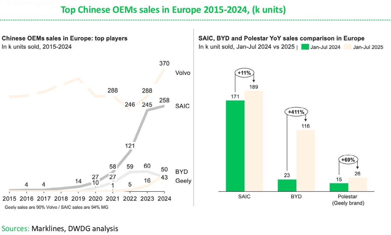 Drept urmare, excedentul comercial auto al Europei cu China s-a redus. A scăzut de la 17 miliarde de euro în 2020 la 5 miliarde de euro în 2023 și la 1,8 miliarde de euro anul trecut.