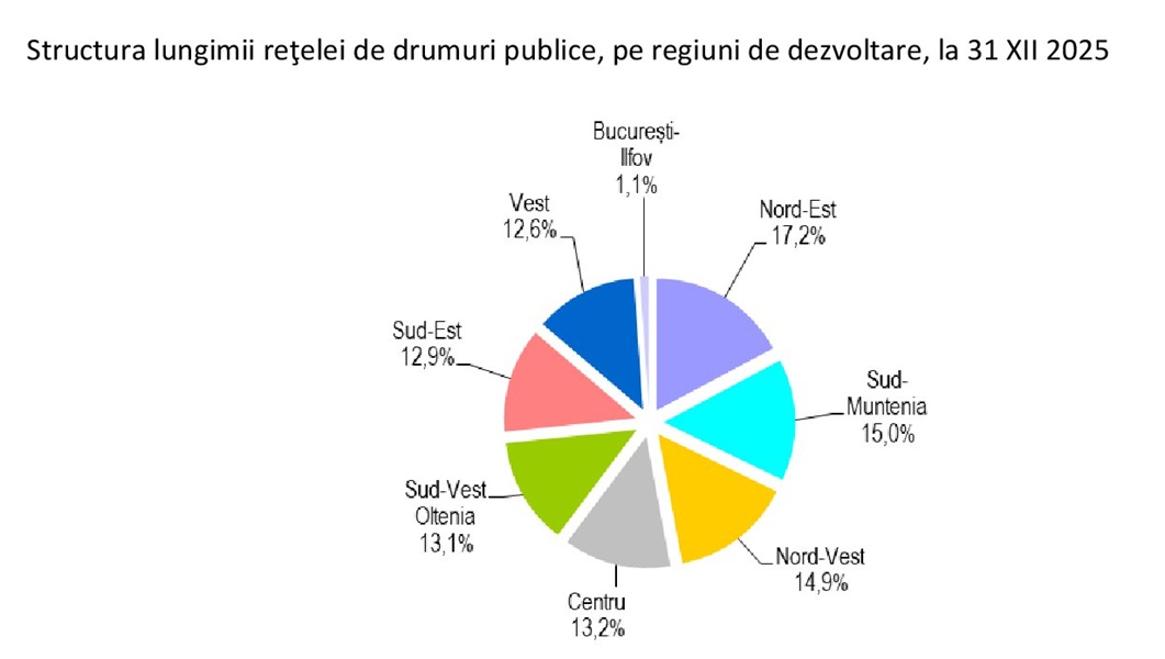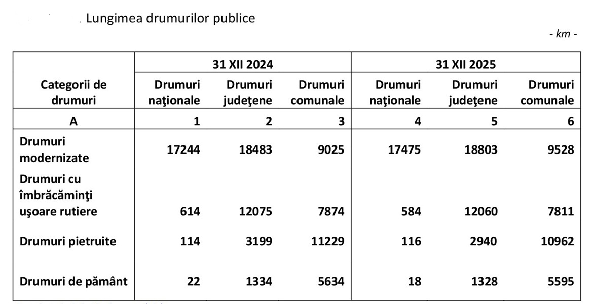 La 31 decembrie 2025, lungimea rețelei de drumuri publice totaliza 87.220 km, din care 18193 km (20,8%) drumuri naţionale, 35.131 km (40,3%) drumuri judeţene şi 33.896 km (38,9%), drumuri comunale, arată datele publicate, vineri, de Institutul Național de Statistică.