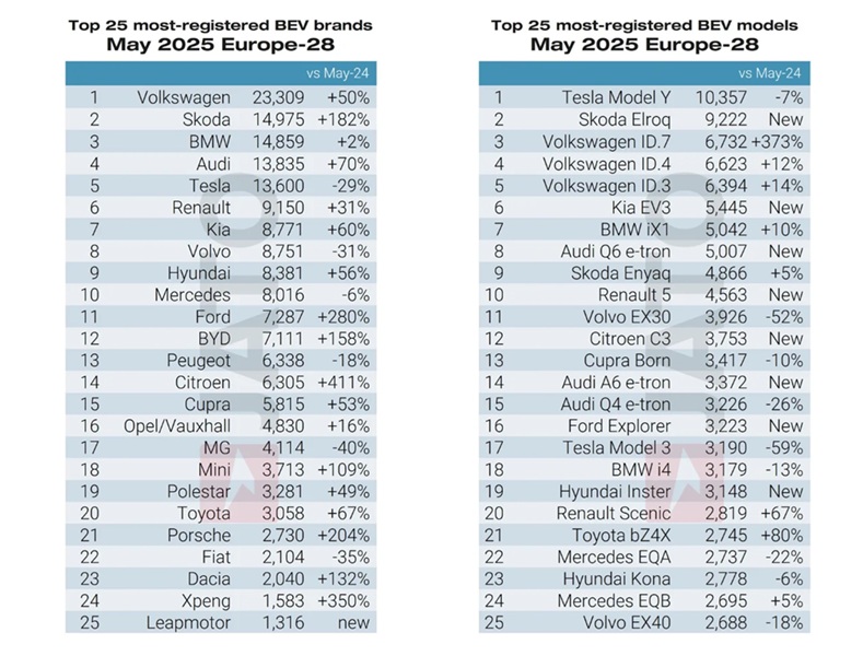 Cu 14.975 de înmatriculări noi (+182%), Skoda a depășit BMW și și-a asigurat locul al doilea în topul mărcilor de vehicule electrice (BEV). Motorul creșterii a fost noua Skoda Elroq, care a ajuns imediat pe locul al doilea în clasamentul pe modele, cu 9.222 de unități. În total, Elroq are deja peste 24.000 de înmatriculări în primele 5 luni din 2025, un început puternic pentru un nou-venit.