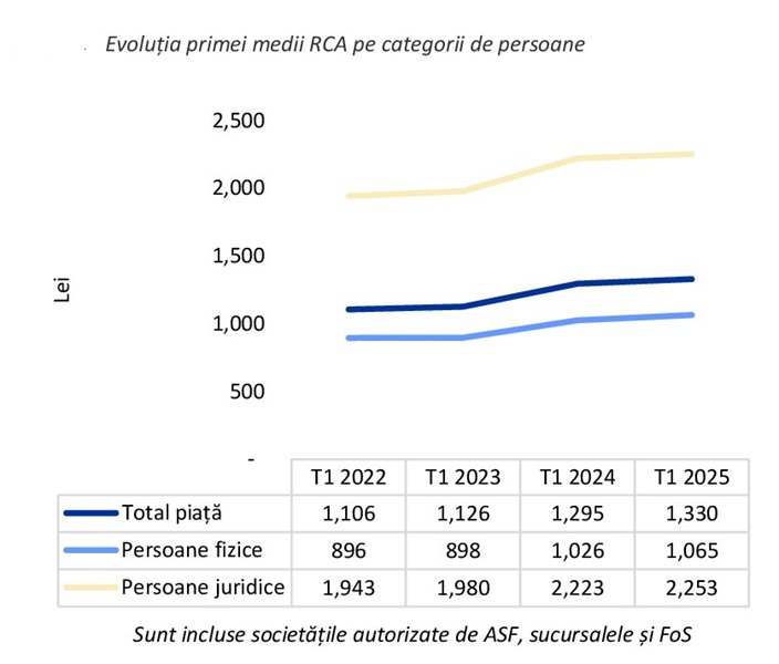 Pe ansamblul întregii piețe, prima medie RCA anualizată s-a situat în jurul valorii de 1.330 lei în trimestrul I 2025, în creștere cu 3% comparativ cu trimestrul I 2024. Prima medie RCA anualizată a crescut cu 4% pentru persoanele fizice, respectiv cu 1% pentru persoanele juridice.