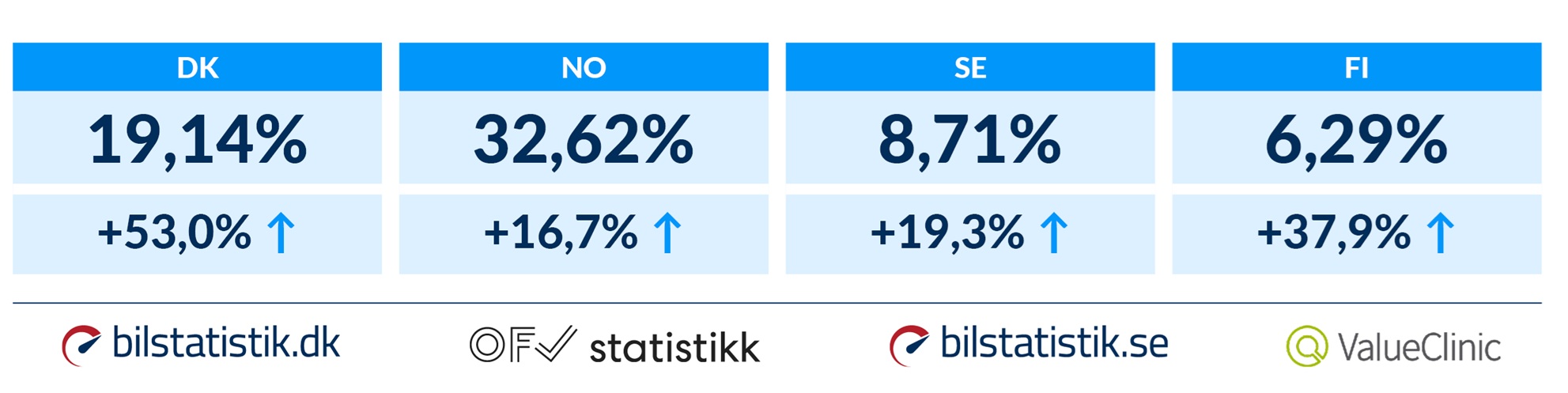 În țările nordice, vehiculele electrice continuă să își extindă ponderea în vânzările de mașini noi.