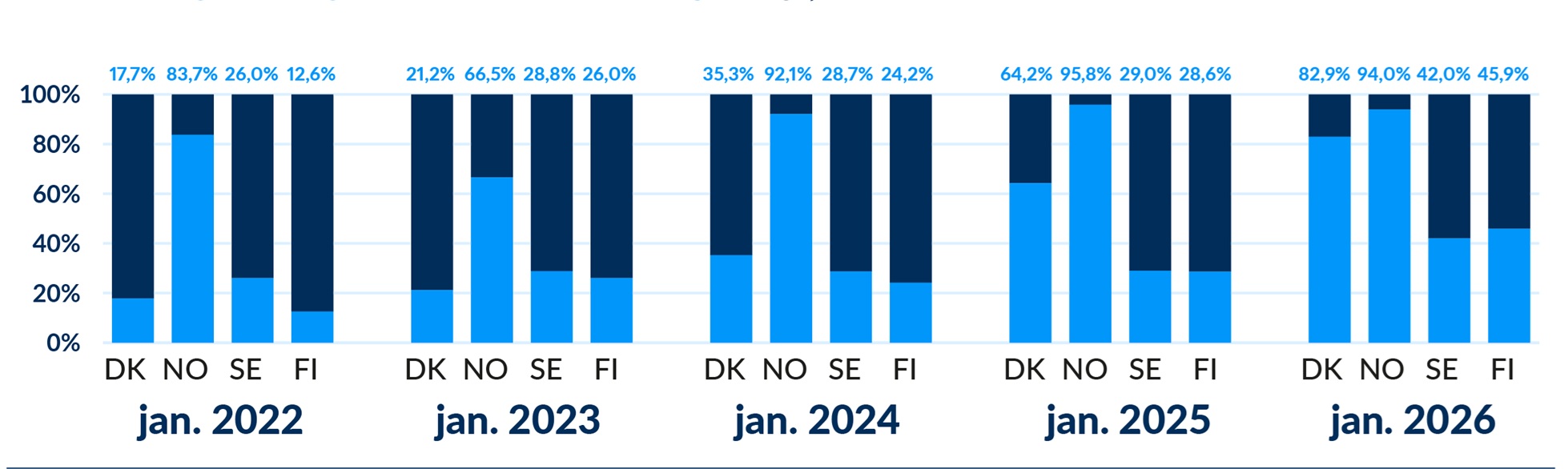 Analiștii spun că datele din ianuarie reconfirmă faptul că schimbările dramatice în structura pieței și în setările de politici continuă să modeleze peisajul vehiculelor de la începutul anului 2026 în țările nordice.