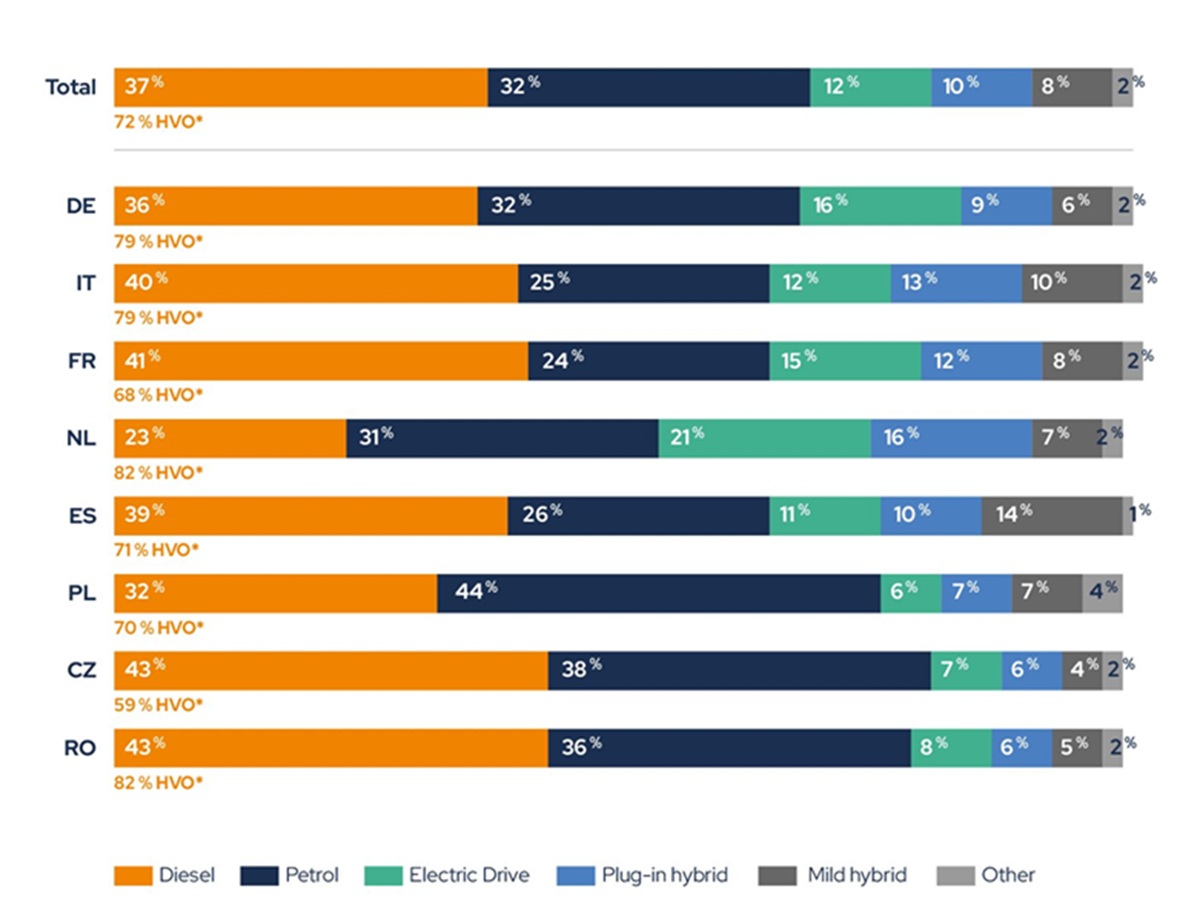 În ciuda trecerii continue către mobilitatea electrică, sistemele de propulsie tradiționale continuă să domine flotele corporative europene. Motorina rămâne cel mai comun tip de combustibil, urmată de benzină. Cu toate acestea, sistemele de propulsie electrificate – cum ar fi vehiculele electrice cu baterie și hibridele plug-in – câștigă constant teren. Această schimbare este vizibilă în special în țări precum Olanda, care au deja o pondere peste medie a vehiculelor complet electrice în flotele corporative.