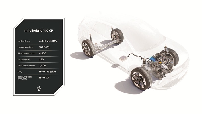 Motorizarea mild hybrid de 140 CP: pe Symbioz, acest prim nivel de hibridizare se bazează pe un motor pe benzină turbo de 1,3 litri în 4 cilindri cu injecție directă. Disponibilă cu o cutie de viteze manuală cu 6 trepte, această versiune atinge un echilibru optim între performanță și economie de combustibil. Motorul este susținut de un alternator de pornire și o baterie litiu-ion de 12V. Cu grupul motopropulsor mild hybrid de 12 V și 140 CP, Symbioz are un cuplu maxim de 260 Nm disponibil între 1.750 și 3.500 rpm și un consum combinat de combustibil de doar 5,9 l/100 km, cu emisii de CO2 începând de la 133 g/km.