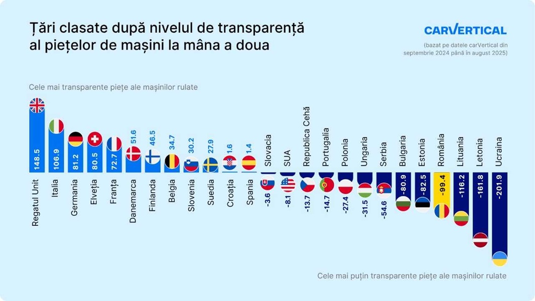 Studiul carVertical a analizat rapoartele de istoric achiziționate de clienți între septembrie 2024 și august 2025. Indicele de transparență se bazează pe șase indicatori: