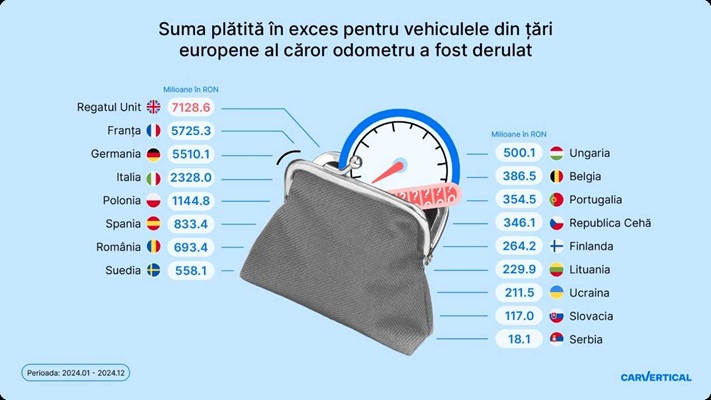 Luând în calcul numărul de mașini verificate de carVertical, valoarea lor medie de piață și rata de fraudă din fiecare țară, studiul estimează că Marea Britanie pierde anual în jur de 7 miliarde de lei din cauza manipularii odometrelor, Franța pierde 5,7 miliarde de lei, iar Germania 5,5 miliarde de lei.
