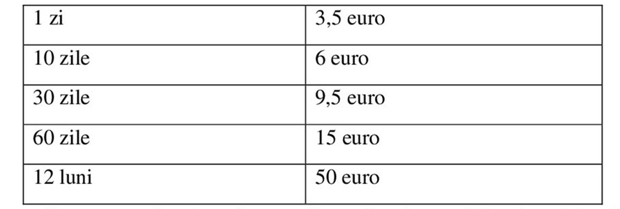 În prezent, rovinieta pentru o zi costă 2,5 euro, cu TVa inclusă, cea pentru 10 zile – 3,3 euro, pentru 30 de zile – 5,3 euro, pentru 60 de zile – 8,4 euro iar pentru 12 luni – 28 de euro.