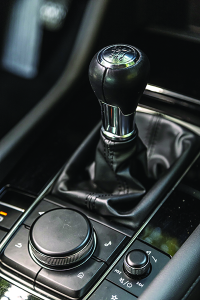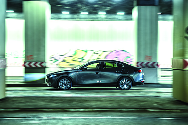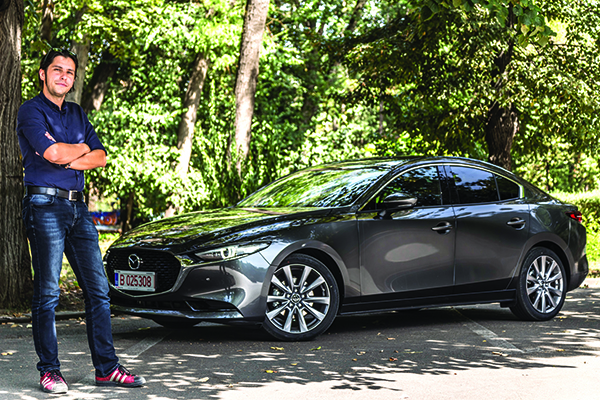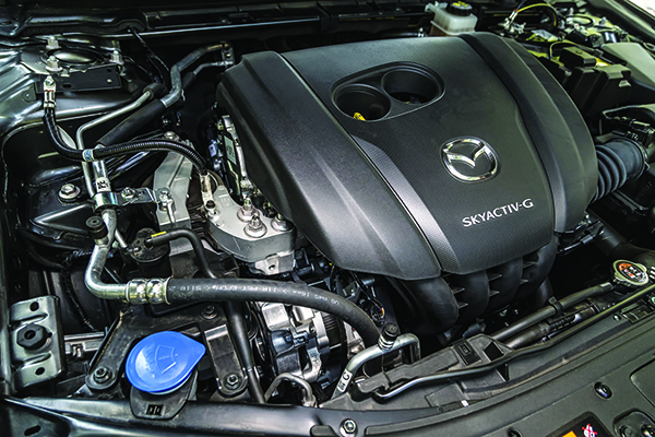 Sub capota exemplarului meu Mazda3 Sedan lucrează un sistem mild-hybrid, asistat de un mic motor/generator electric de 7 CP, ”legat” printr-o curea de cauciuc la motorul termic și pus în legătură cu o mică baterie Li-ion de 0,17 kWh, ce funcționează la 24 V. În plus, motorul pe benzină dezactivează cilindrii 1 și 4 la sarcini mici, fără ca șoferul să simtă acest lucru, altfel decât la pompă: pe drum național, consumul a stat la 5,2 l/100 km.