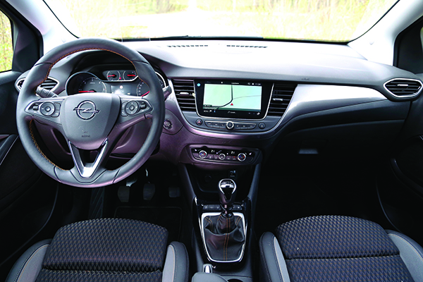 Pentru un SUV mic, interiorul oferă multă calitate, cu plastice moi pe bord și o combinație tapițerie textilă cu piele artificială pe margini care arată foarte bine (504 euro fără TVA). Șoferul stă la 59 cm de sol, cu circa 10 cm mai sus decât într-un hatch într-un scaun AGR bine configurat cu șezut extensibil și este de apreciat că deși Crossland X este construit pe platforma lui Peugeot 2008, interiorul este diferit, fiind în ton cu filozofia Opel.