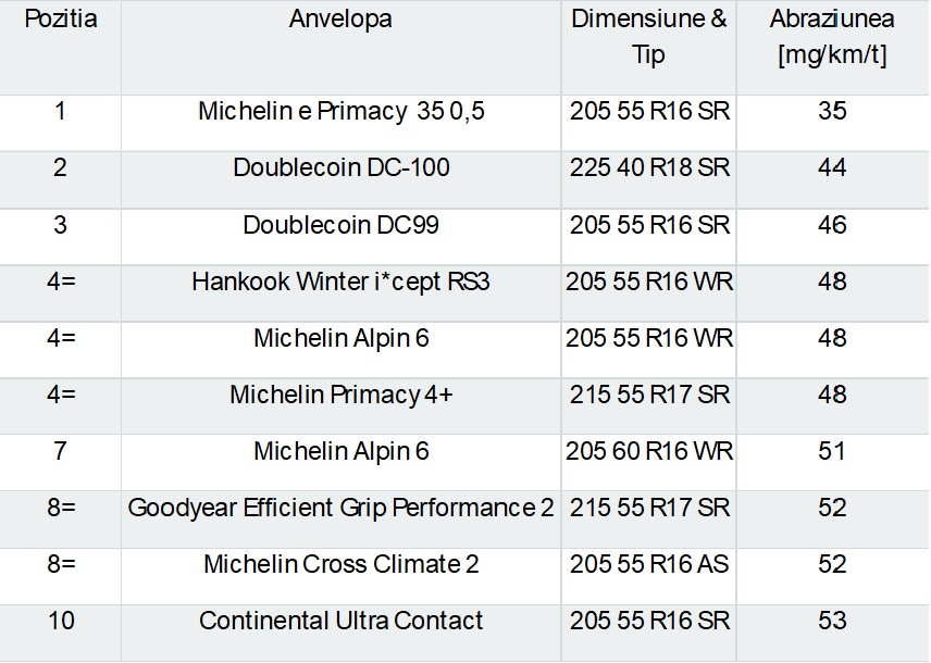 Anvelopele Michelin s-au dovedit a fi câștigătorii clari, pierzând în medie 52 mg/km pe tonă de vehicul, urmate de Hankook (62 mg/km/t) și Continental (63 mg/km/t).