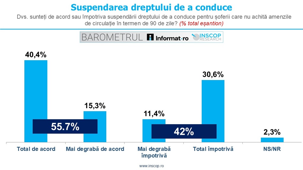 În proporție de 55,7%, românii susțin măsura suspendării dreptului de a conduce pentru șoferii care nu achită amenzile de circulație în termen de 90 de zile, 40,4% dintre participanții la sondaj sunt total de acord cu suspendarea, iar 15,3% sunt mai degrabă de acord). Alți 11,4% sunt mai degrabă împotrivă, iar 30,6% total, împotriva măsurii. Ponderea non-răspunsurilor este de 2,4%.