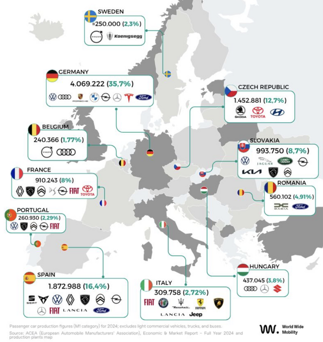 Un studiu realizat de World Wide Mobility arată că, în 2024, Uniunea Europeană și-a consolidat rolul de pilon cheie în producția globală de automobile, Germania, Spania și Republica Cehă fiind țările în care se fabrică cele mai multe de vehicule de pasageri.