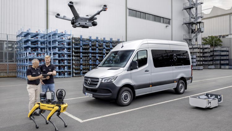 La fabrica de autoutilitare Mercedes-Benz din Düsseldorf, câinele robot „Aris” contribuie la întreținere și economisirea energiei. În plus, o dronă optimizează procesele logistice prin numărare automată.